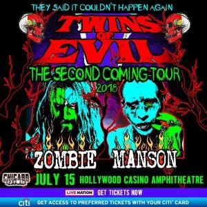 Another day and another big summer co-headlining tour has been announced, this time it’s Rob Zombie & Marilyn Manson and the Twins of Evil Tour at the Hollywood Casino Amphitheatre in Chicago on July 15th.