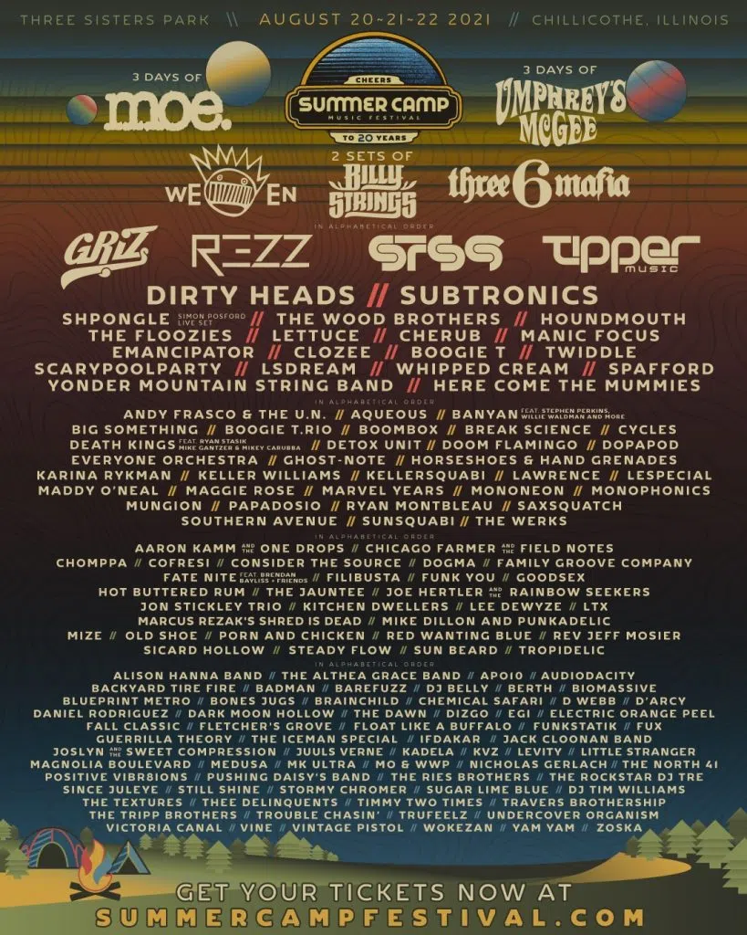Get ready for 3 Days of Live Music, Art, and Experiences, August 20-22nd at Three Sisters Park in Chillicothe, IL. Featuring Ween, Billy Strings, Three 6 Mafia, GRiZ, Rezz, STS9, Tipper, And of course 3 Days of Moe. and Umphrey’s McGee, tickets at SummerCampFestival.com Get ready for an unforgettable weekend